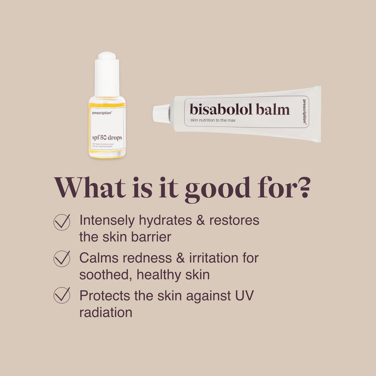 Wil je je huid goed beschermen tegen UV-straling? En wil je graag een mooie egale textuur? Dan schrijven we je de spf50 drops en de Bisabolol balm voor. De spf50 drops beschermen jouw huid tegen de zon en de Bisabolol balm verzacht en kalmeert de huid.