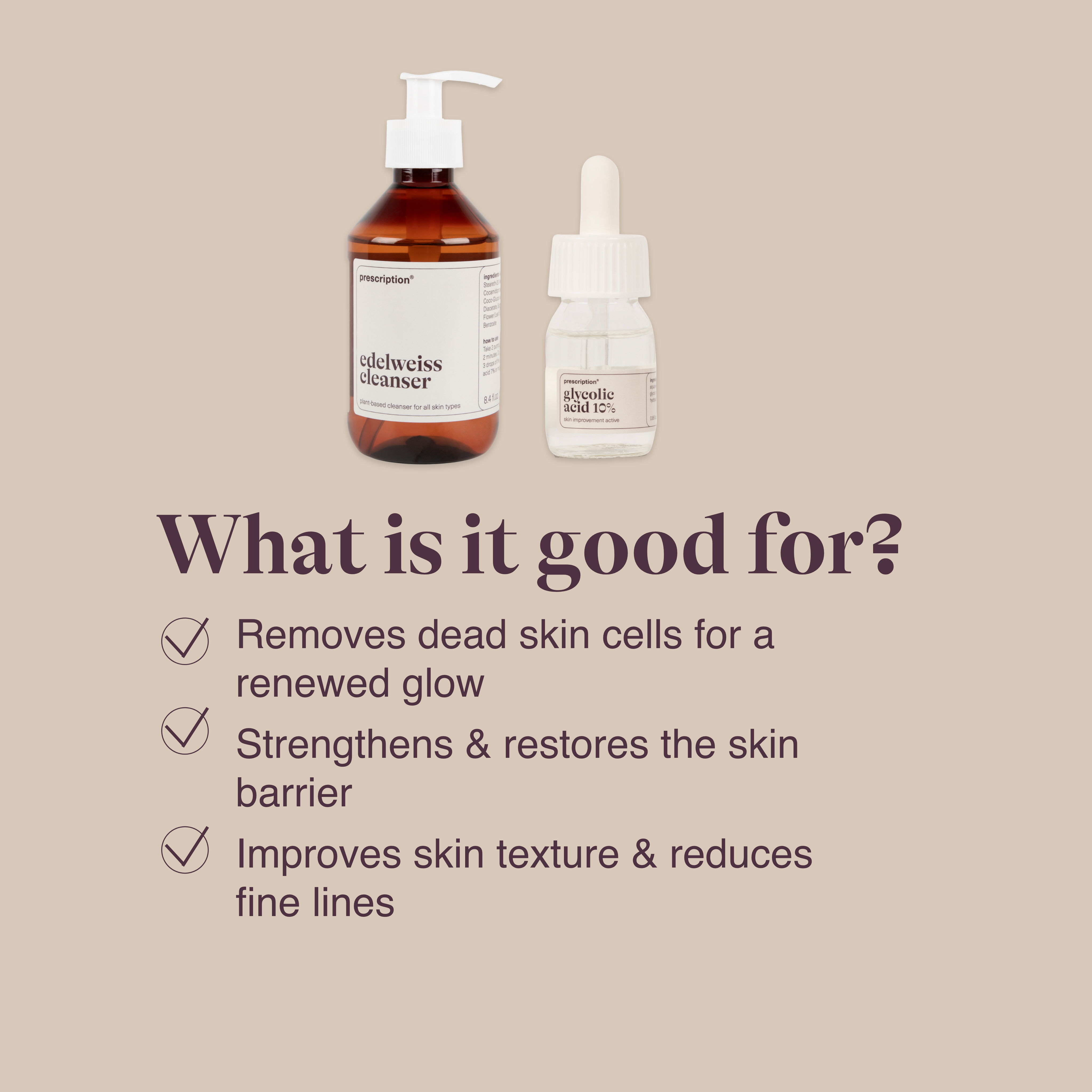 De combinatie van Edelweiss Cleanser en Glycolic Acid 10% is ontwikkeld om huidvernieuwing op een gecontroleerde en huidvriendelijke manier te ondersteunen. Een schone, rustige huid is essentieel voor effectieve exfoliatie. De Edelweiss Cleanser verwijdert vuil, talg en onzuiverheden zonder de natuurlijke huidbarrière aan te tasten, waardoor de huid optimaal voorbereid is op actieve ingrediënten.
